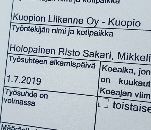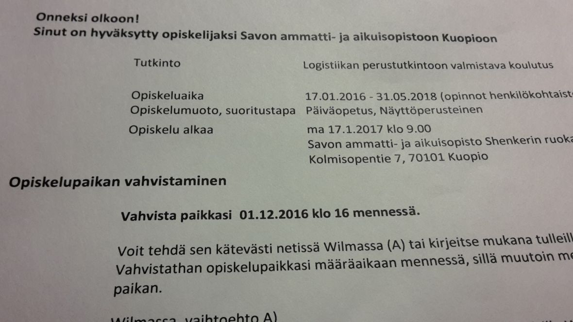 Minut on siis valittu Kuopioon opiskelemaan logistiikan perustutkintoa, josta pitäisi valmistua linja-autonkuljettajaksi.
