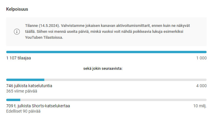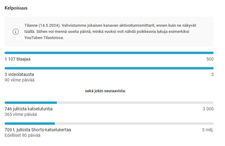 Ns. kevennetyillä ehdoilla rajat ovat lähempänä, mutta silti hommaa on vielä jäljellä. En ota stressiä tästä. Nämä rajat täyttyvät jos ovat täyttyäkseen. Minun elantoni ei ole kiinni YouTubesta ja vahva usko siihen on, että luultavasti ennemmin minä tienaan YouTubesta kuin päädyn parisuhteeseen. Tämä on vahva veikkaus, mutta ei siitä sen enempää.