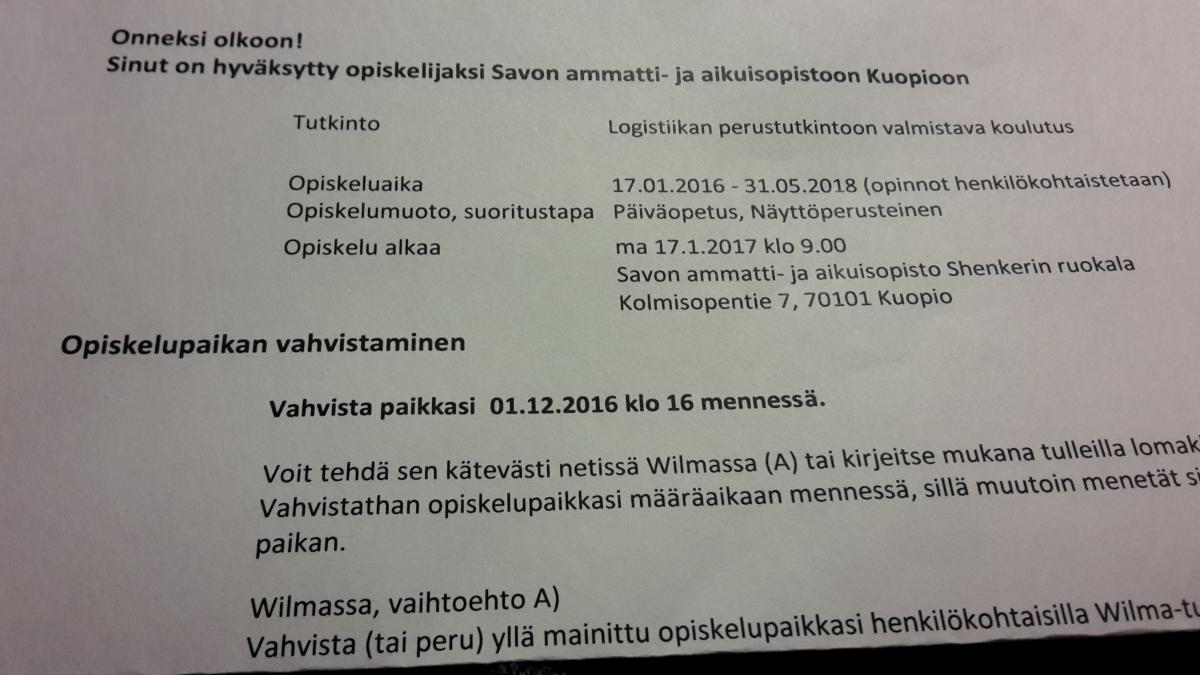 2016 loppuvuodesta kävin Kuopiossa logistiikan perustutkinnon pääsykokeissa. Noh, ihan putkeen ei mennyt koko homma, koska pääsykokeissa oli haastattelun lisäksi myös ”ajonäyte”, jossa yritettiin vissiinkin puhuttaa haastateltava ristiin.