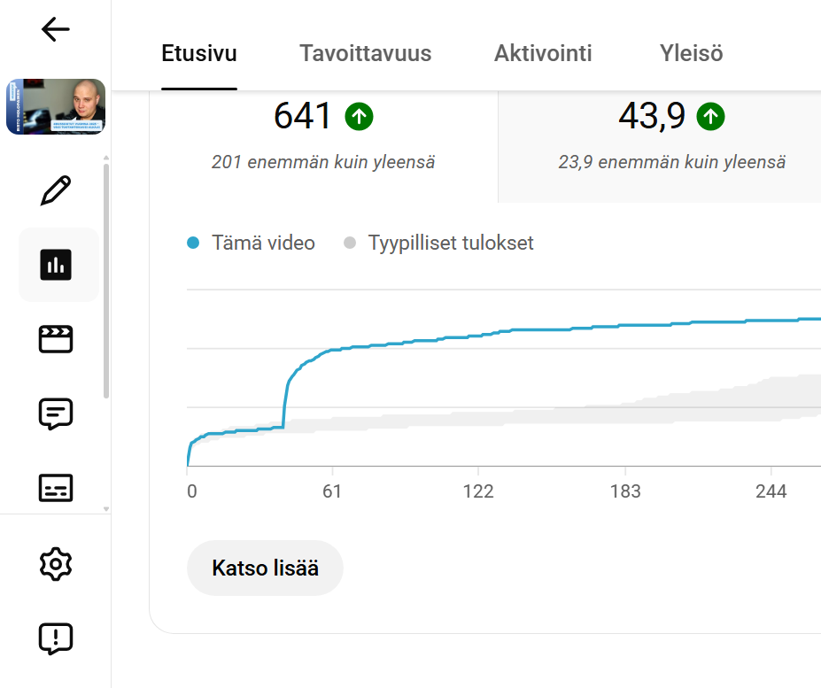Olen sitä mieltä, että vaikka tuo aiemmin mainittu shorts-video vääristääkin lukuja, niin siitä oli myös ehdottomasti hyötyä, kun sillä on saatu YouTuben algoritmit tarttumaan sisältööni entistä hanakammin.